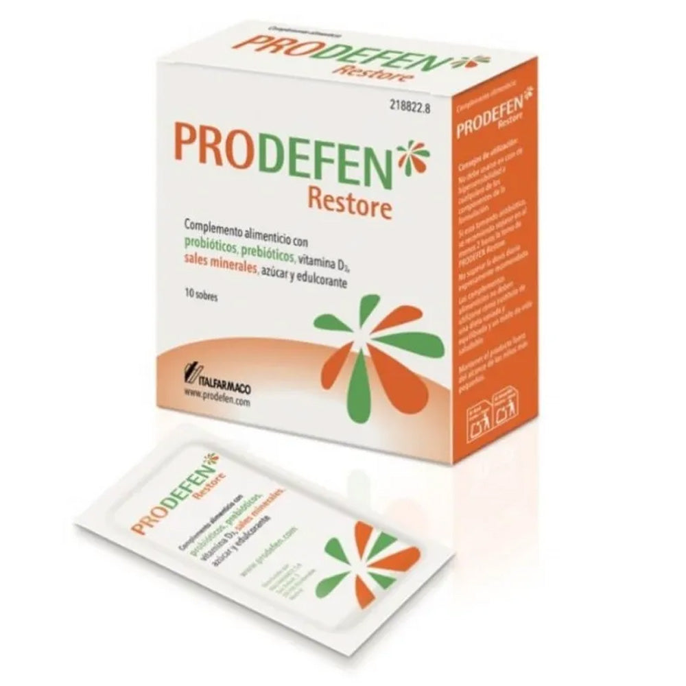 Prodefen Restore 10 Sobres contiene una mezcla de probióticos (Lactobacillus acidophilus, Bifidobacterium lactis, Lactobacillus plantarum) y prebióticos (inulina), que trabajan en conjunto para restaurar y mantener el equilibrio de la flora intestinal, promoviendo la salud digestiva y fortaleciendo el sistema inmunológico.