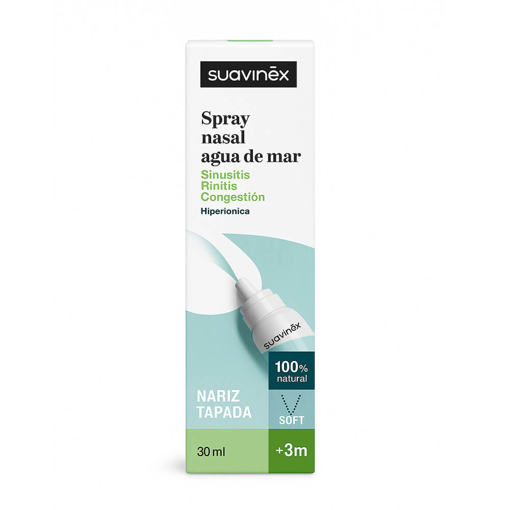 Suavinex Spray Nasal Agua De Mar Hipertónica+3 es un producto de cuidado nasal indicado para bebés, niños y adultos que necesitan una limpieza eficaz y suave de las fosas nasales. Presentado en un formato spray de 30 ml, facilita la aplicación rápida y cómoda del agua de mar hipertónica, ideal para aliviar la congestión nasal y mantener las vías respiratorias limpias.