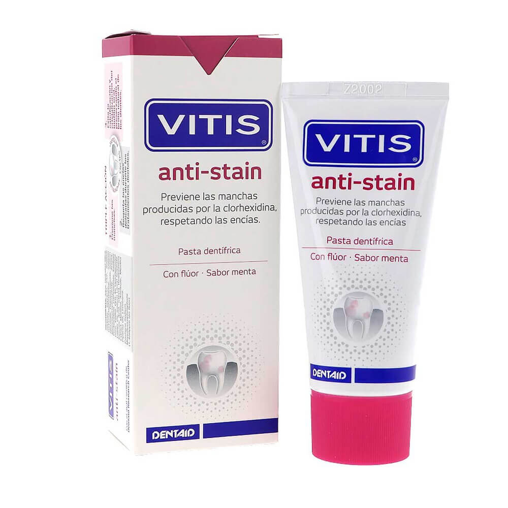 Vitis Anti-Stain es una pasta dentífrica especialmente formulada para adultos que buscan eliminar y prevenir manchas superficiales en sus dientes. Su formato en tubo de 50 ml es ideal para un uso diario cómodo y efectivo, ayudando a mantener una sonrisa más blanca y saludable sin dañar el esmalte dental.